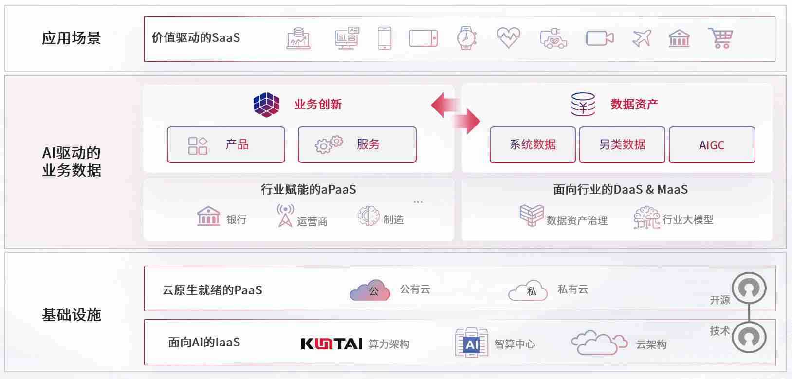 数字时代,,,,围绕企业数字化转型的关键要素,,,,尊龙z6数码开创性的提出数云融合战略和技术体系框架,,着力在云原生、、、、数字原生、、AI原生和信创产业上架构产品和服务能力,,为处在不同数字化转型阶段的快消零售、、、、汽车、、、金融、、、、医疗、、政企、、教育、、运营商等行业客户提供泛在的敏捷IT能力和融合的数据驱动能力,,构建跨界融合创新的数字业务场景和新业务模式,,,,助力企业级客户建立面向未来的核心能力和竞争优势,,全面推动社会的数字化、、、智能化转型升级。。